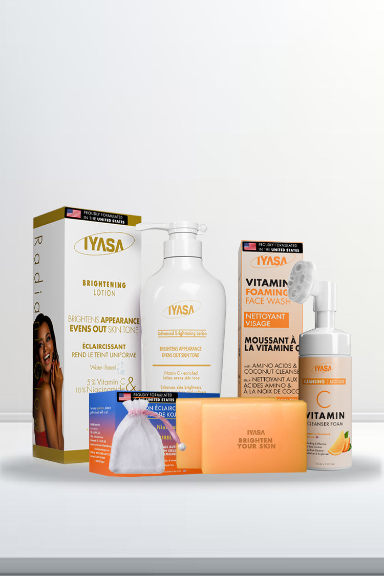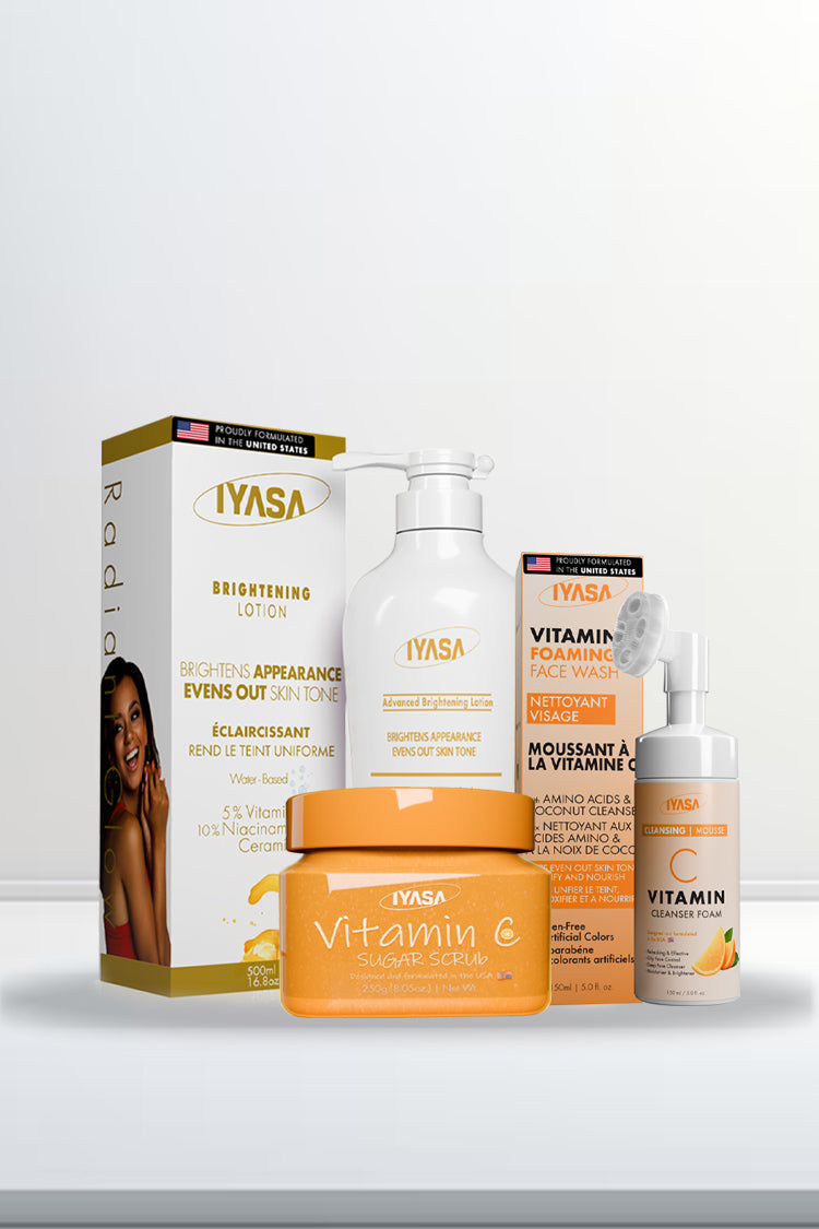• PM: Cleanse → Sugar Scrub (2–3× weekly) → Brightening Lotion